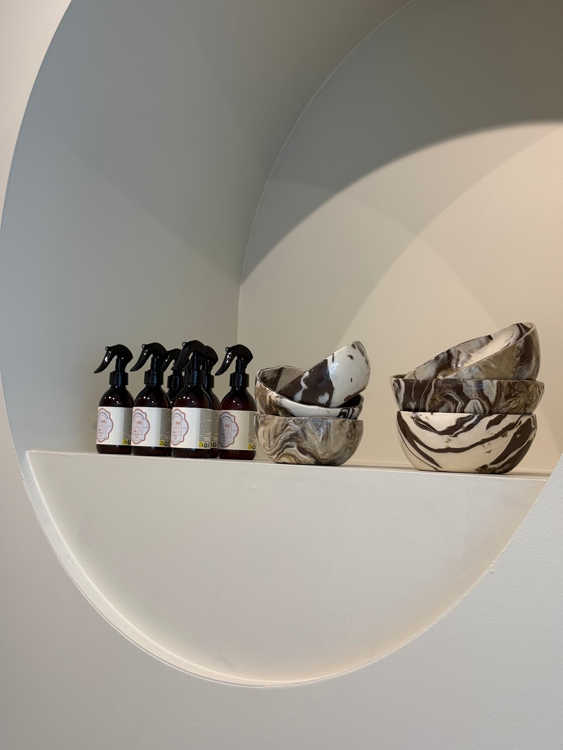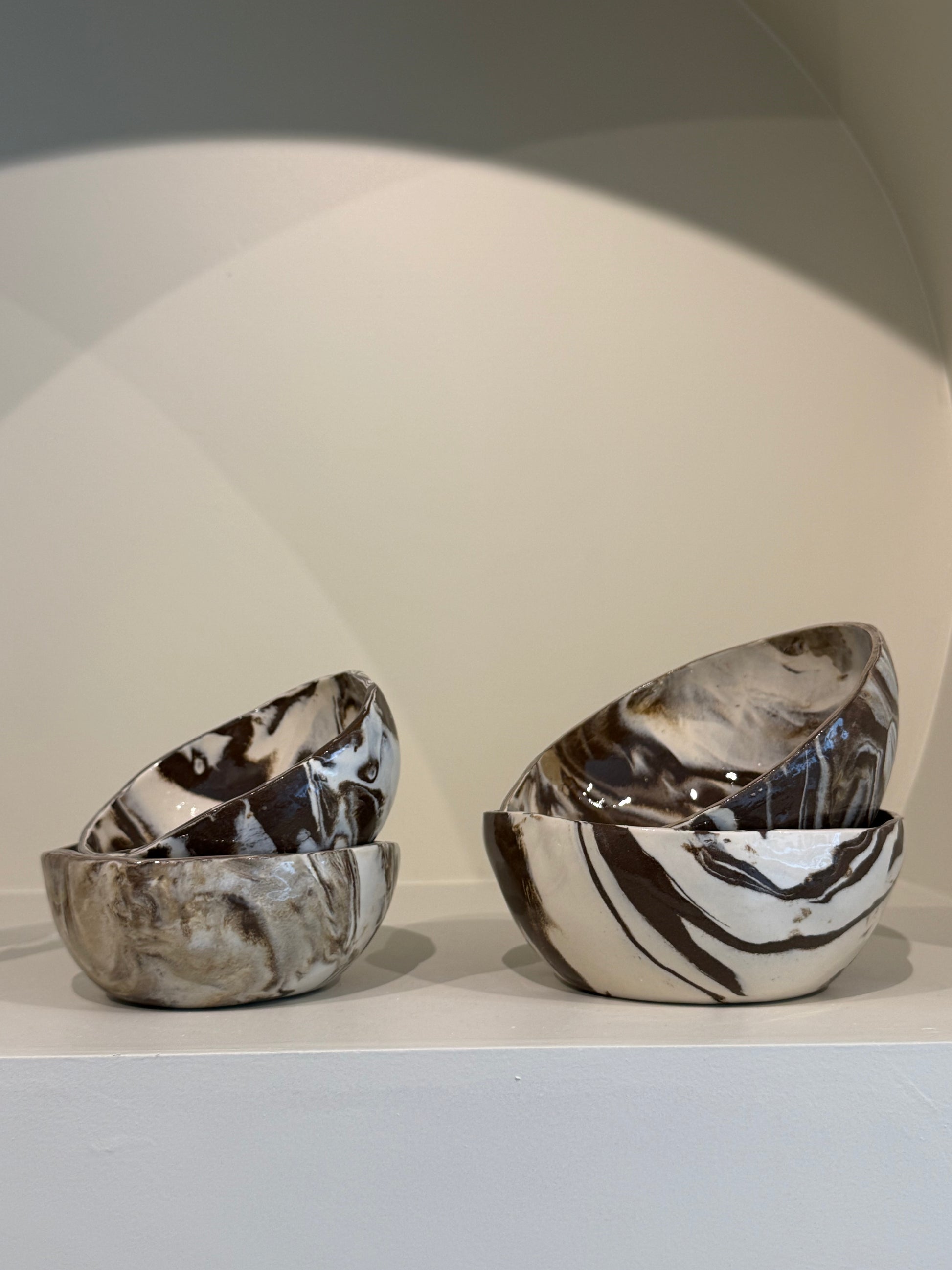 This bowl is made from white, brown and beige stoneware clay. The bowl is finished with a transparent glaze. Each bowl has his own unique marbled pattern and shape due to the handmade process of the bowls.